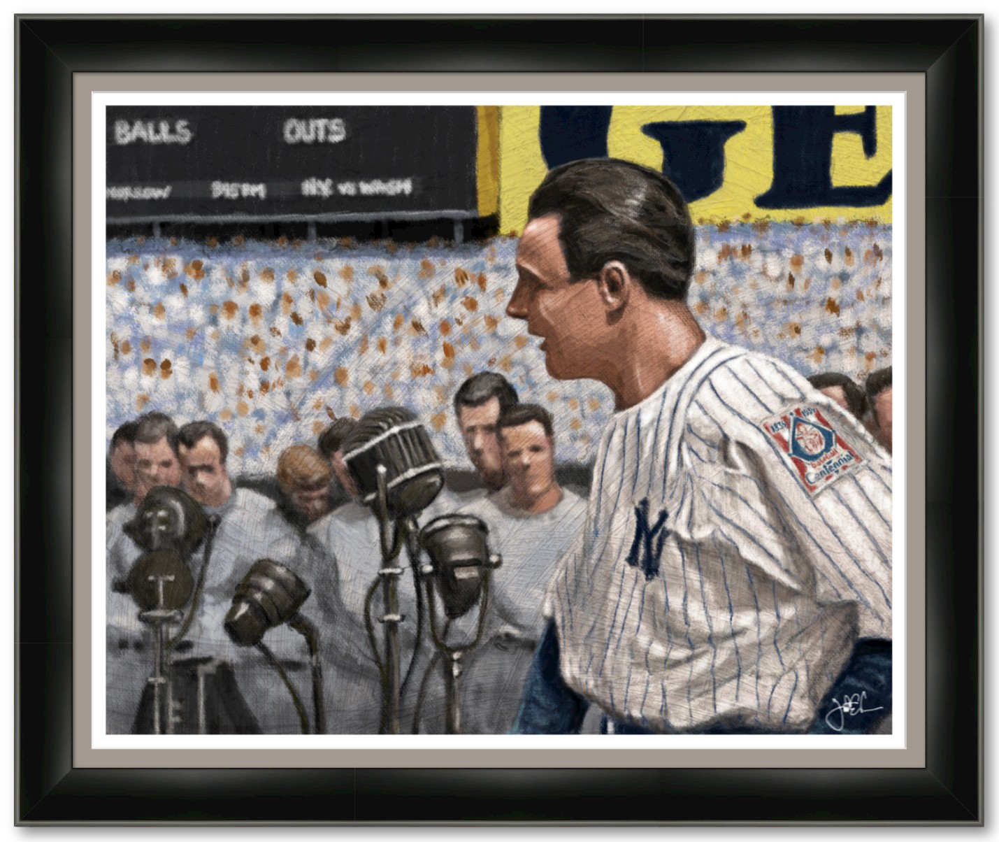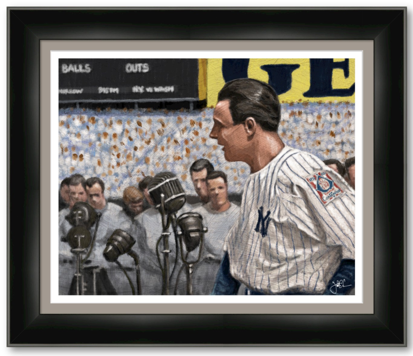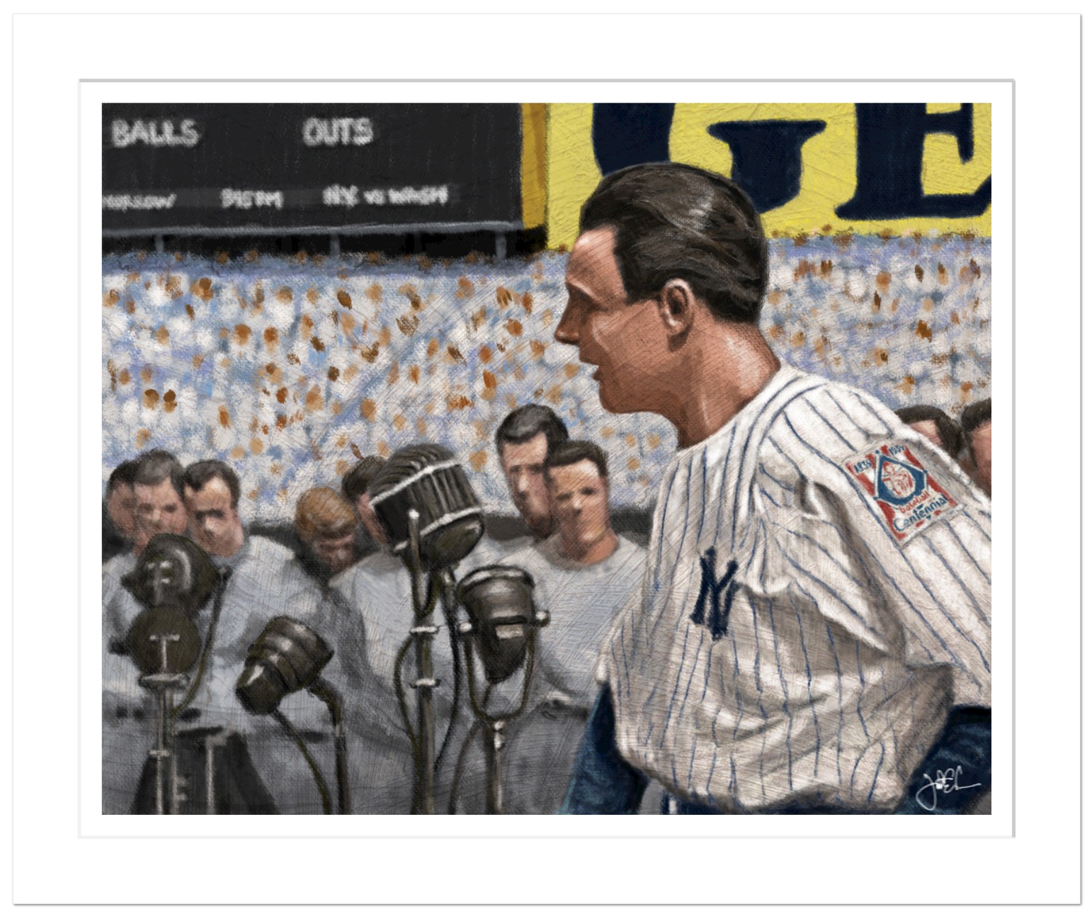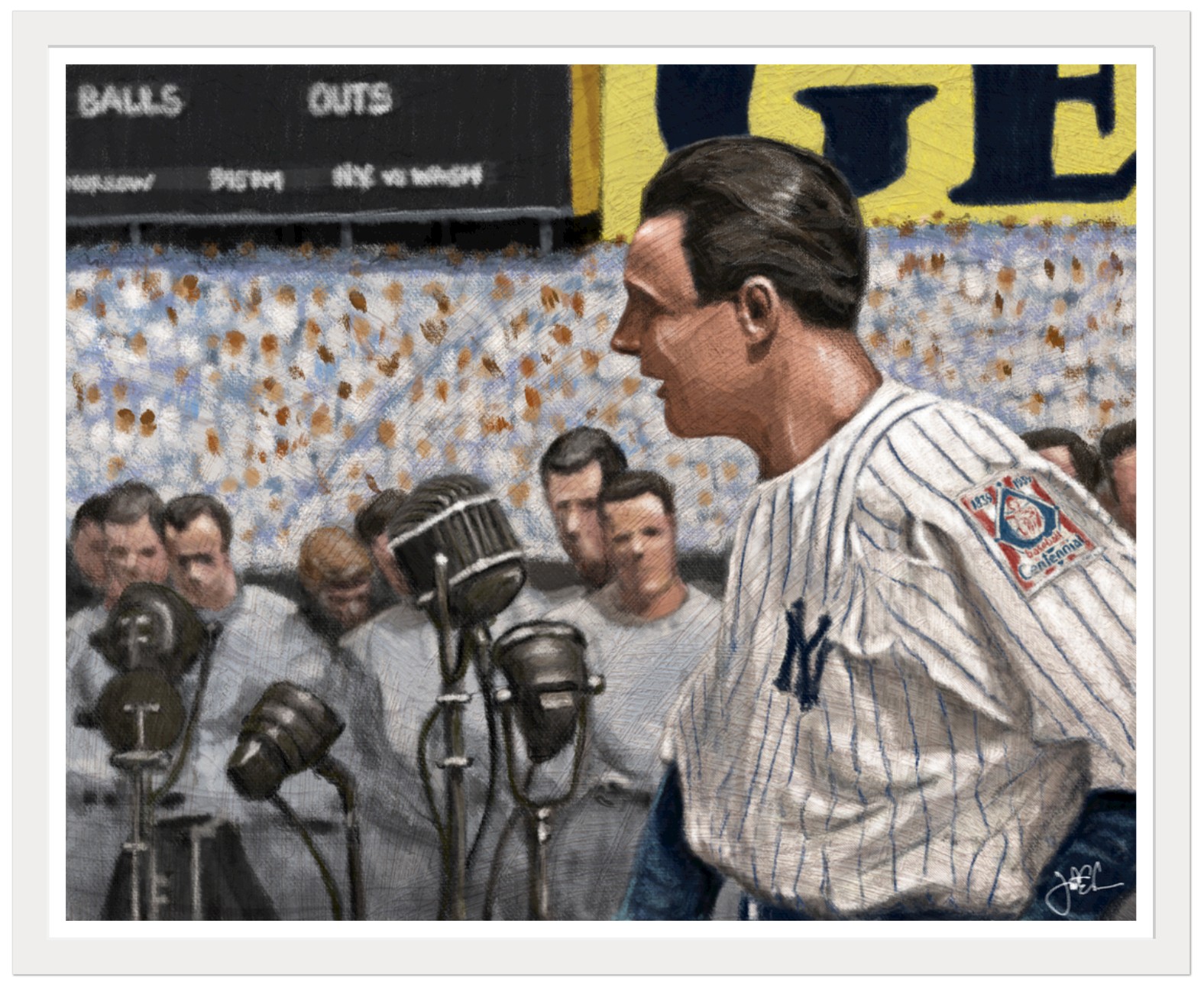 The Luckiest Man is a digital painting by Indianapolis artist Jonathan Carr, capturing Lou Gehrig moments before delivering one of the most unforgettable speeches in sports history. Surrounded by microphones and the quiet weight of the crowd, Gehrig stands with calm strength at Yankee Stadium—an icon not only of baseball, but of humility and courage. Painted in a soft, vintage style with an emphasis on atmosphere and emotion, the piece honors a moment that still echoes through American history.